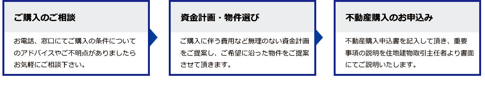 不動産購入申込書を記入して頂き、重要 事項の説明を住地建物取引主任者より書面 にてご説明いたします。 |